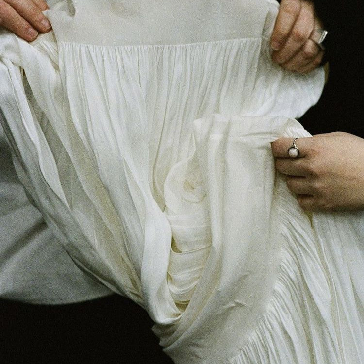 Silk moves with you - breathable, featherlight, and naturally cooling. Its delicate sheen is matched only by its quiet strength, making it perfect for warm climates and timeless silhouettes.