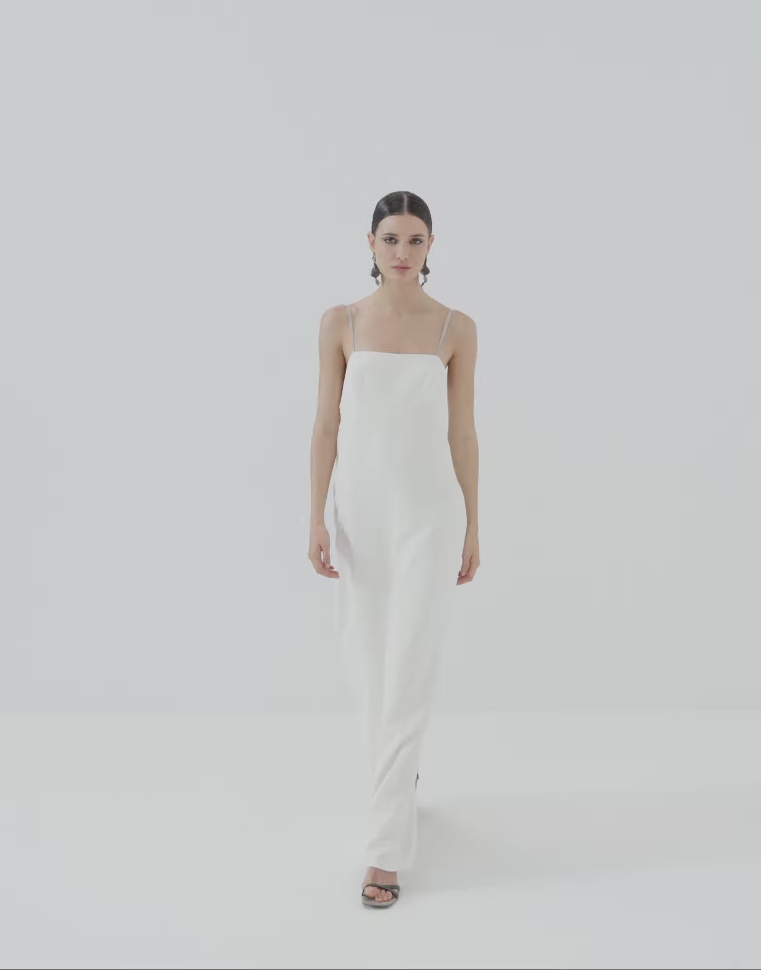 The neckline drapes gently off the shoulders, framed by sculpted pleats that define the upper bodice. A precise cut-out shapes the waist, flowing into a trench-inspired back panel that merges architectural tailoring with sensual restraint. Functional side pockets and a front zip closure framed by decorative buttons complete the silhouette.